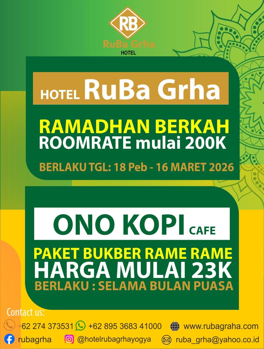 Hotel Ruba Graha hadir di kota yang bernuansa Budaya & Wisata Indonesia dengan sentuhan tersendiri untuk memenuhi kebutuhan Anda. Dengan lokasi yang strategis dekat dengan pusat kota sehingga memudahkan Anda untuk menikmati tempat wisata di Kota Yogyakarta seperti Keraton, Malioboro, Kebun Binatang serta tempat-tempat wisata lainnya dengan waktu relatif singkat dan sarana transportasi yang mudah dari Hotel Ruba Graha. Dengan Kebersamaan dan kekeluargaan kami melayani Anda penuh keramah-tamahan sebagai ciri khas utama Yogyakarta